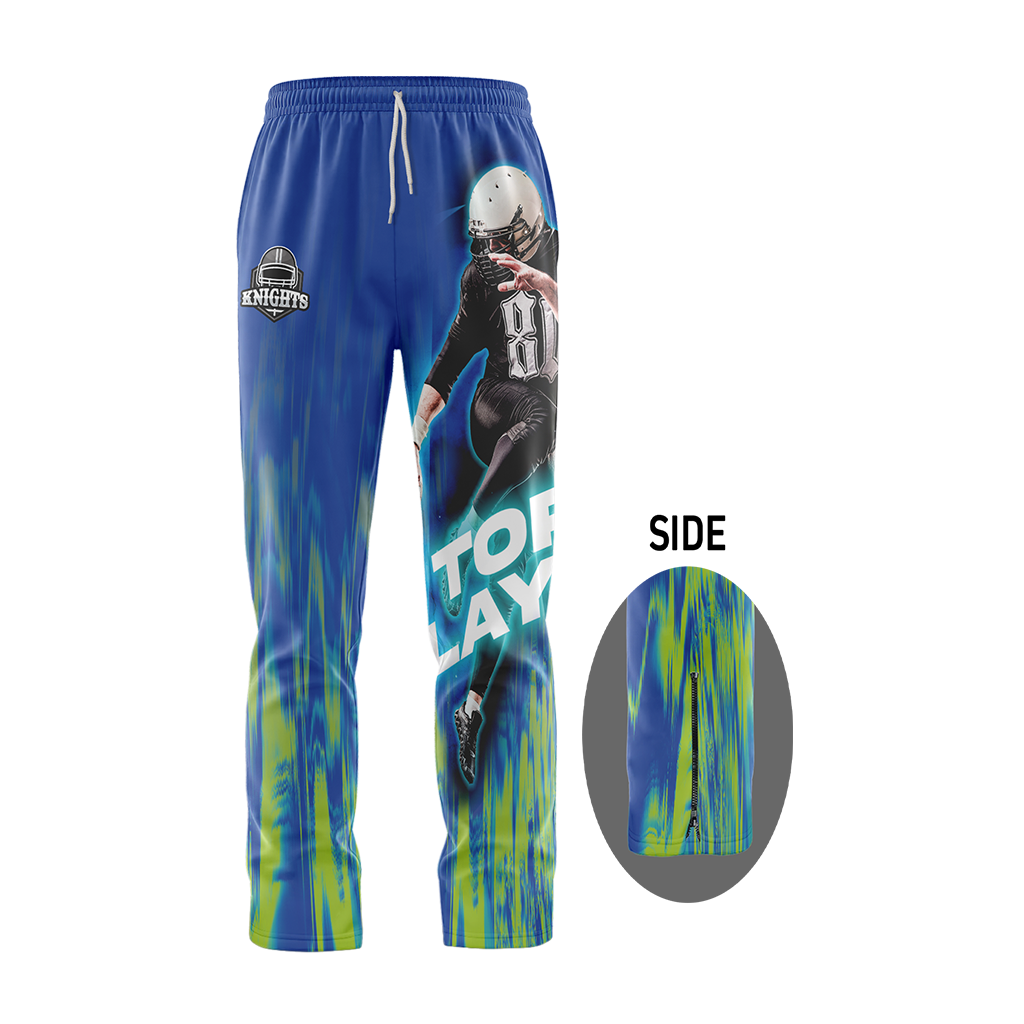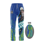 Långbyxa med dragkedja vid benavslut som finns i tre olika material som standard. Har sidofickor med dragkedja och midja med resår och snörning. Alla material i återvunnen polyester (R-PET) med sublimeringstryck i fullfärg över hela plagget.